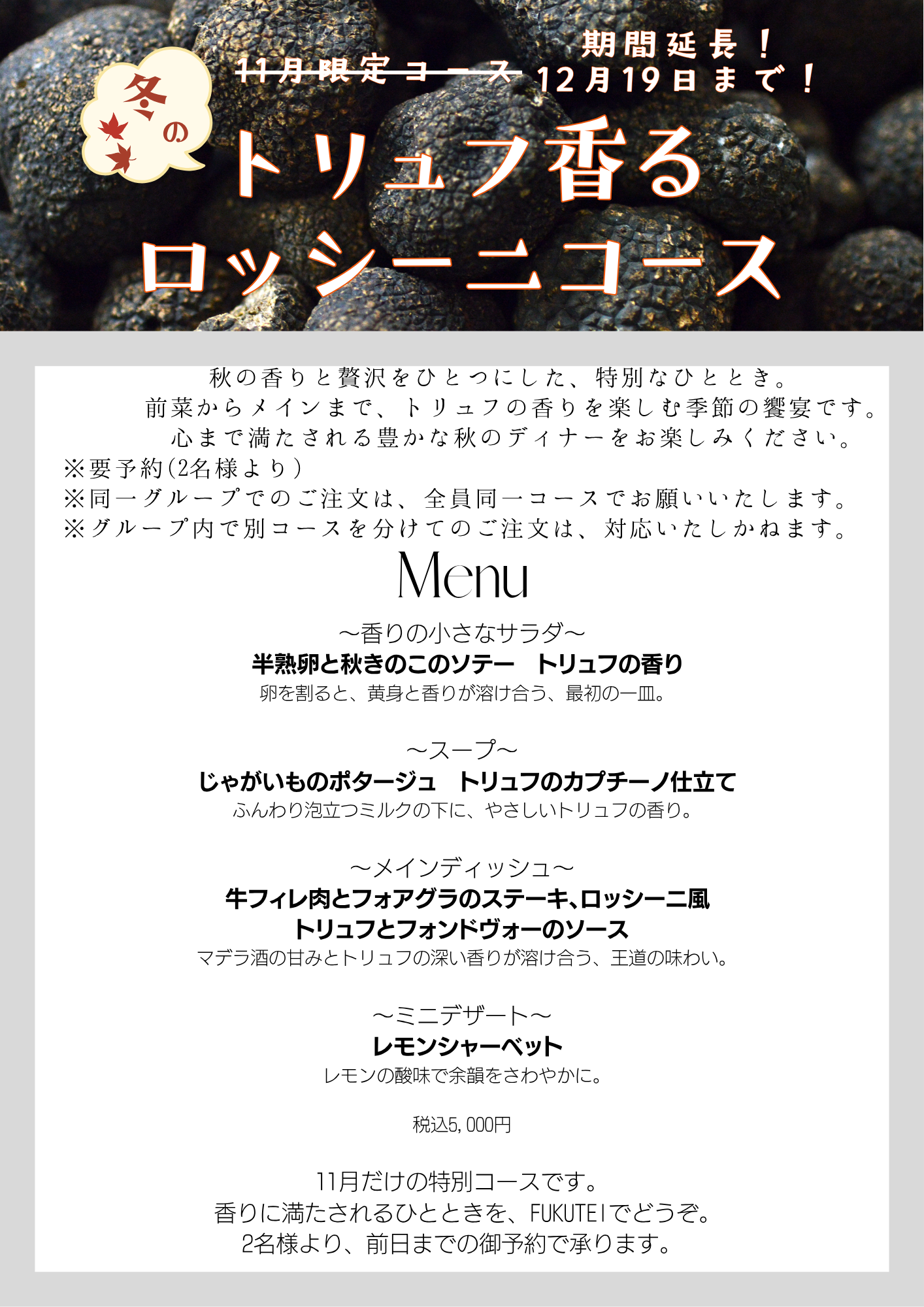 ロッシーニコースは2名様より、1グループ同一メニュー注文で承ります。