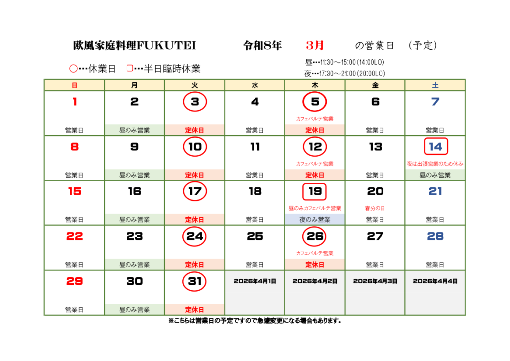 2026.3営業予定日